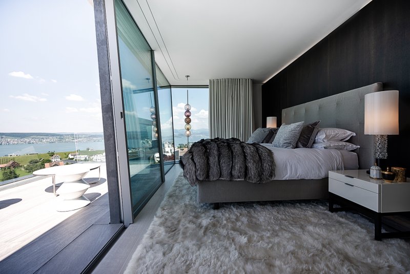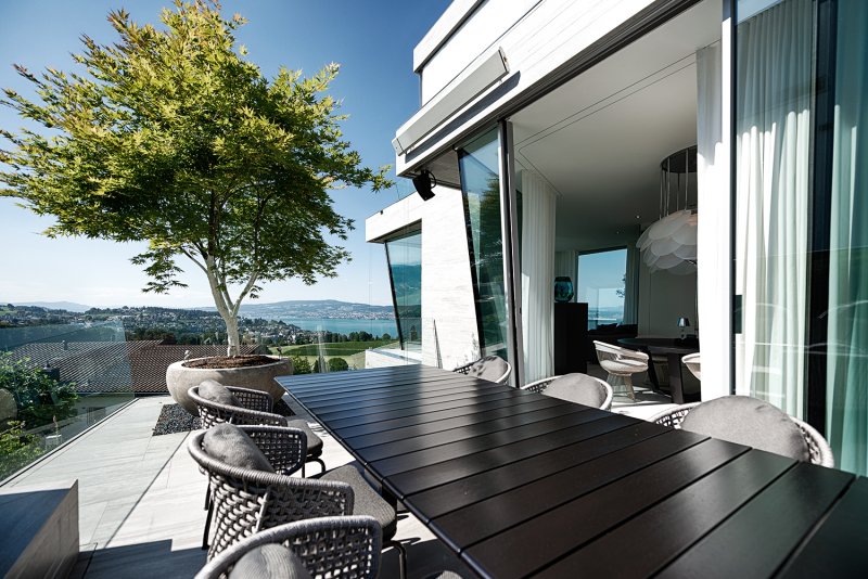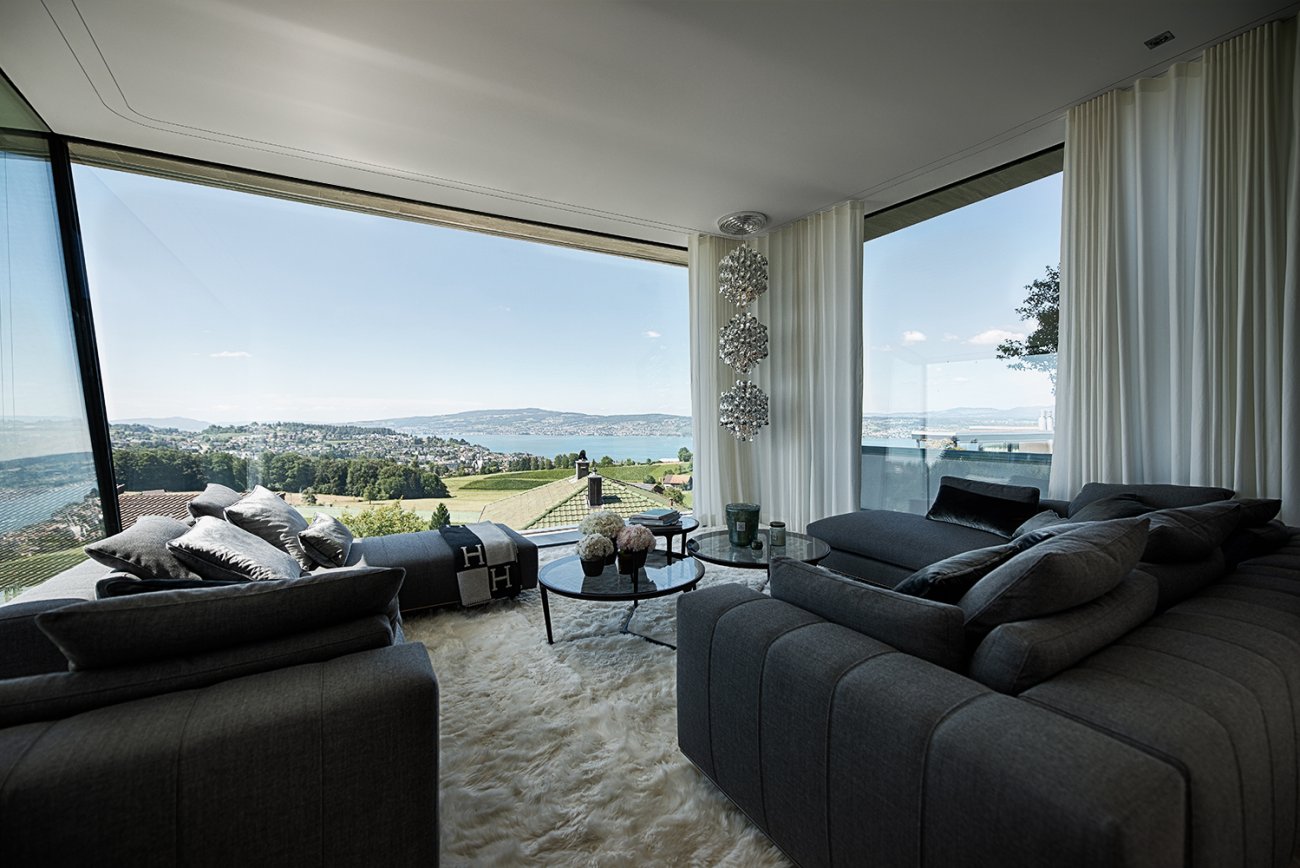 hoch situiert mit atemberaubendem blick über den zürichsee, besticht diese villa in ihren klaren formen.